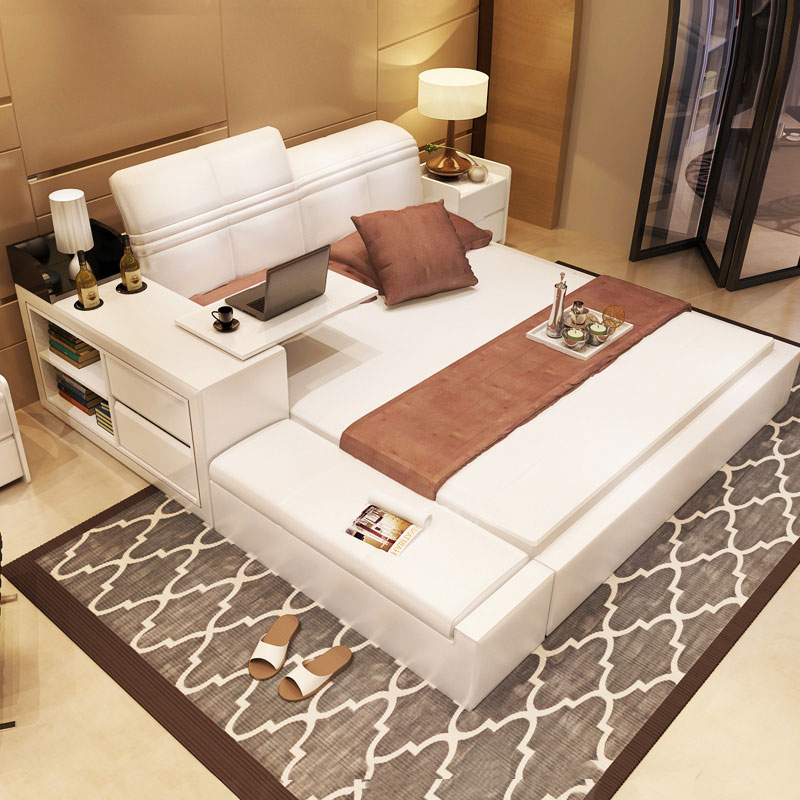 商品名称:创意真皮床双人床现代婚床1.8米1.5榻榻米床储物床皮艺床软床大床 床侧储物 升降靠背 双ll价格 更低